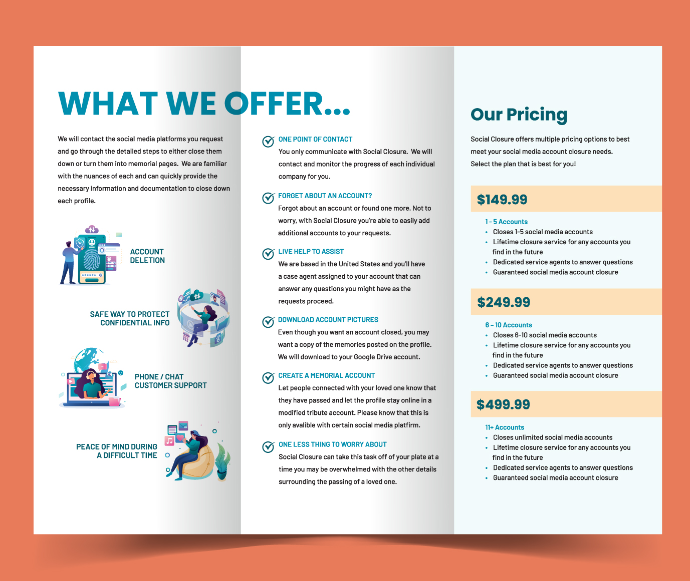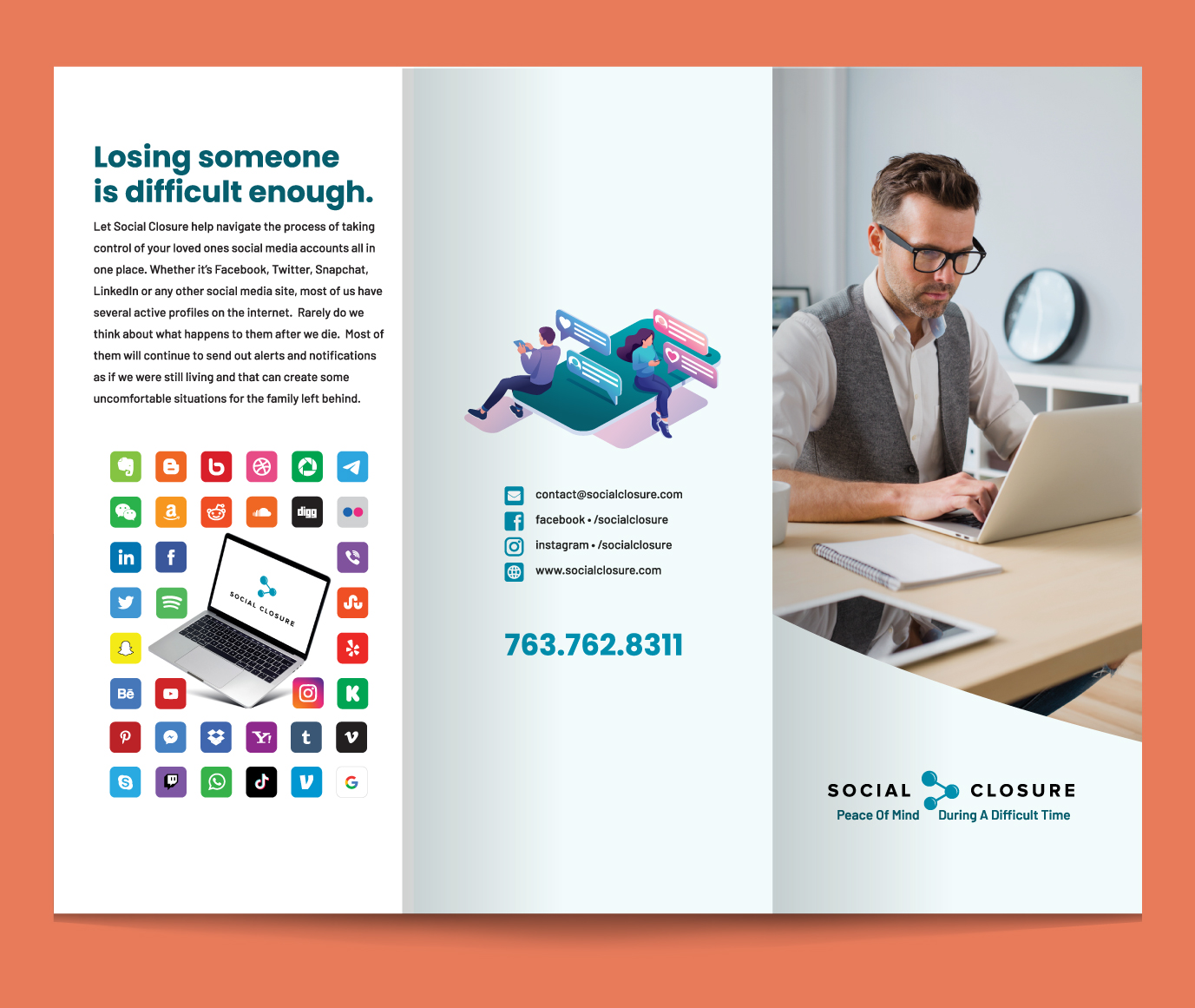 Social Closure’s logo and brand design are crafted to convey compassion and clarity in managing social media accounts after a loved one’s passing. The visual identity reflects our mission of providing families with a supportive and streamlined solution during a challenging time. With thoughtful branding and cohesive marketing materials, we aim to create a reassuring presence that emphasizes the importance of honoring memories while navigating the complexities of digital legacies.